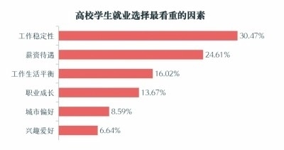 對我國東、中、西部地區(qū)7個省區(qū)市的14所本科院校、4所??圃盒?,覆蓋研究生、本科生、專科生三類群體,隨機(jī)抽樣的1829份調(diào)查問卷顯示,除工作穩(wěn)定性、薪資待遇外,工作生活平衡、職業(yè)成長、所在城市、興趣愛好等,也是高校學(xué)生就業(yè)選擇時看重的因素。