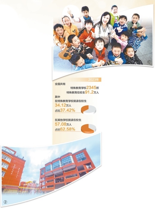 黨的十八大以來(lái),從支持特殊教育,到辦好特殊教育,再到強(qiáng)化特殊教育普惠發(fā)展,我國(guó)特殊教育發(fā)展內(nèi)涵逐步深化,特殊教育普及水平和保障條件得到提升。2023年,全國(guó)共有特殊教育學(xué)校2345所,特殊教育在校生91.2萬(wàn)人,其中,在特殊教育學(xué)校就讀在校生34.12萬(wàn)人,占比37.42%;在其他學(xué)校就讀在校生57.08萬(wàn)人,占比62.58%。