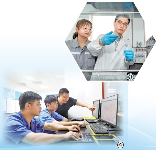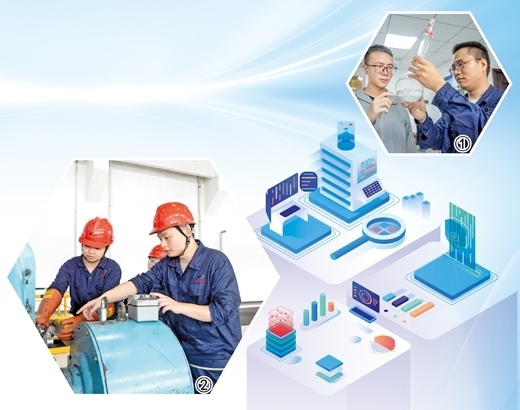 圖①:東港熱電公司博士創(chuàng)新站博士(左)與企業(yè)員工討論實(shí)驗(yàn)反應(yīng)結(jié)果。圖②:東港熱電公司員工(右)帶領(lǐng)參與博士創(chuàng)新站實(shí)踐工作的大學(xué)生檢修設(shè)備。