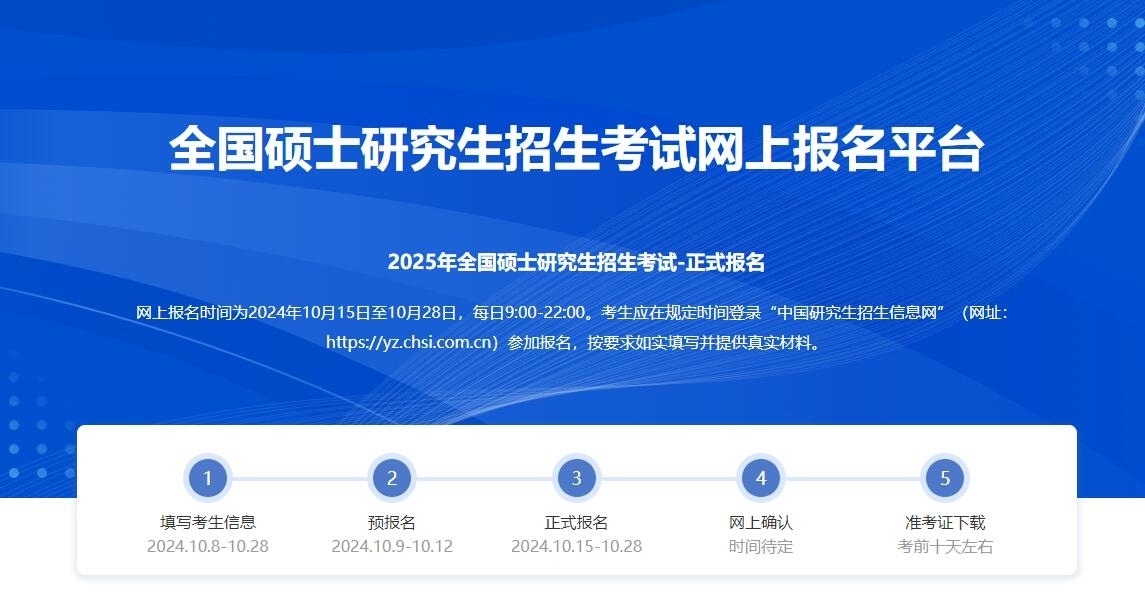 網(wǎng)上報名時間為2024年10月15日至10月28日(網(wǎng)上預(yù)報名時間為2024年10月9日至10月12日,相關(guān)工作安排由各省級教育招生考試機構(gòu)確定并公布),每日9:00-22:00??忌鷳?yīng)在規(guī)定時間登錄“中國研究生招生信息網(wǎng)”(網(wǎng)址:https://yz.chsi.com.cn)參加報名,按要求如實填寫并提供真實材料。