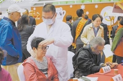10月10日,2024年北京月壇街道重陽節(jié)為老服務市集活動在月壇體育館舉行。北京中醫(yī)藥大學中醫(yī)學院的志愿者用自己所學的專業(yè)知識在市集上為老年人服務。圖為北京中醫(yī)藥大學中醫(yī)學院的志愿者在月壇體育館為老人服務。新華社記者 邢廣利攝