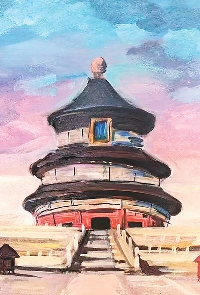 夕陽(yáng)余暉中,新西蘭華裔青少年們?cè)谔靿砟甑罴t墻邊席地而坐,揮動(dòng)畫(huà)筆,捕捉眼前美景?!跋﹃?yáng)下祈年殿更顯壯麗,我希望通過(guò)我的畫(huà)筆展現(xiàn)出它的雄偉?!眳⒃L團(tuán)學(xué)生秦曉寓說(shuō)。