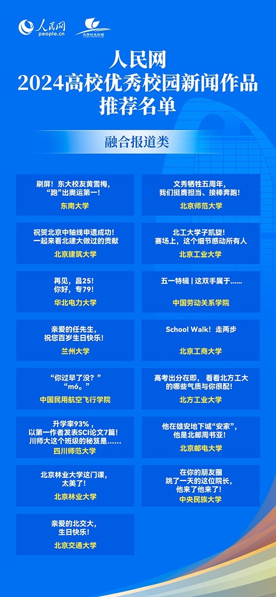 人民網(wǎng)北京12月27日電 (記者孫競(jìng)、李依環(huán))以“推進(jìn)教育科技人才一體發(fā)展 加快建設(shè)教育強(qiáng)國(guó)”為主題的人民網(wǎng)2024大學(xué)校長(zhǎng)論壇27日在人民網(wǎng)“初心”報(bào)告廳舉行。論壇上,人民網(wǎng)2024年高校優(yōu)秀校園新聞作品發(fā)布,50所高校作品入選。