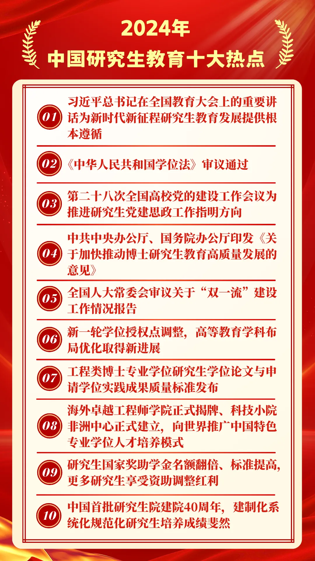 2024年,是中國學位與研究生教育發(fā)展史上具有重要里程碑意義的一年,在教育部學位管理與研究生教育司指導下,教育部學位與研究生教育發(fā)展中心《中國研究生》雜志回顧總結全年研究生教育大事要事和熱點動態(tài),聯(lián)合人民網(wǎng)、新華網(wǎng)、中國教育報和有關研究生教育媒體等共同發(fā)布2024年中國研究生教育十大熱點。