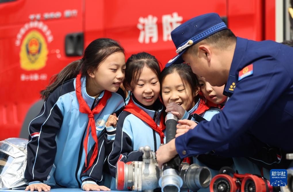 3月31日,在山東省臨沂市郯城縣第三實驗小學,消防救援人員為學生講解消防裝備器材。