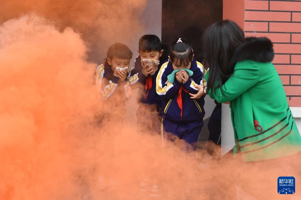 3月31日,在山東省青島市市北區(qū)杭州路小學開展的校園消防安全主題教育活動上,師生模擬校園安全門逃生演練。