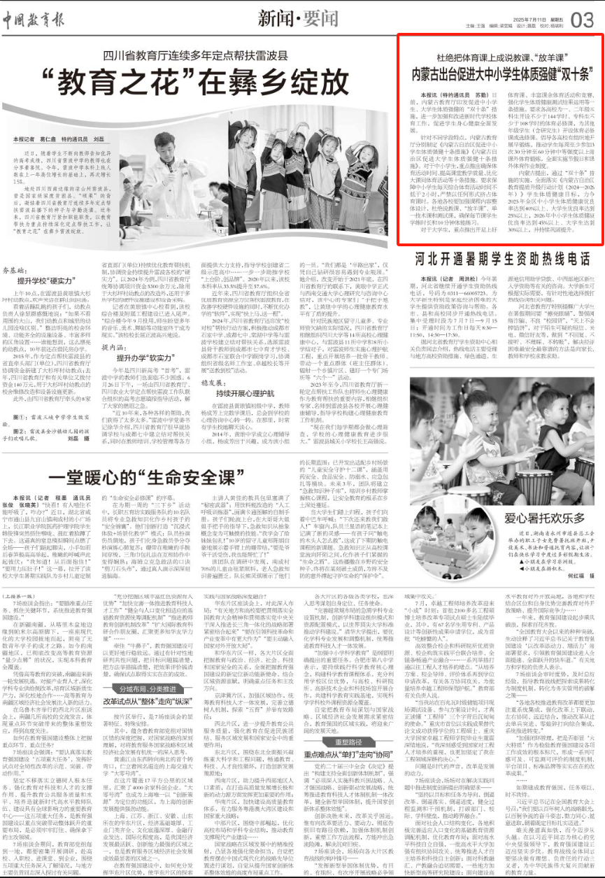 2025年7月11日,《中國教育報》第3版刊發(fā)題為《杜絕把體育課上成說教課、“放羊課”內(nèi)蒙古出臺促進大中小學(xué)生體質(zhì)強健“雙十條”》的文章,報道了內(nèi)蒙古教育廳印發(fā)促進中小學(xué)生、大學(xué)生體質(zhì)強健的“雙十條”措施,進一步加強和改進新時代學(xué)校體育工作,促進學(xué)生身心健康全面發(fā)展。
