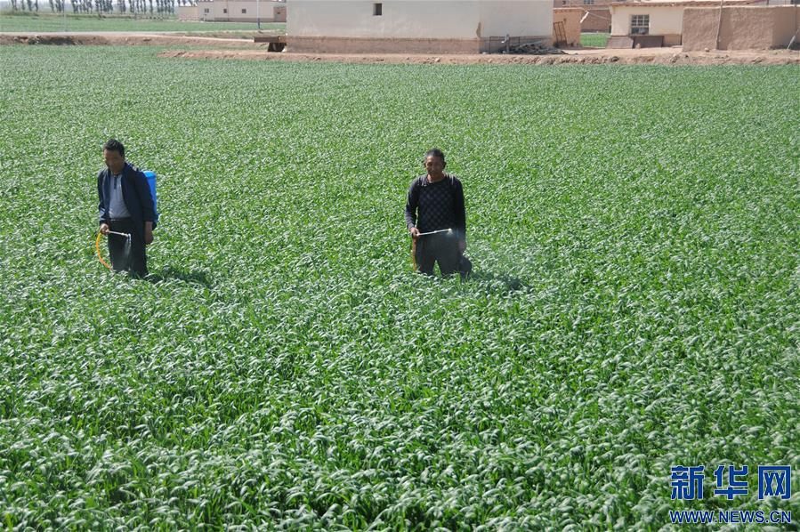 5月28日,內蒙古巴彥淖爾市臨河區(qū)干召廟鎮(zhèn)棋盤村村民在麥田中噴藥防治病蟲害。新華社記者李云平攝