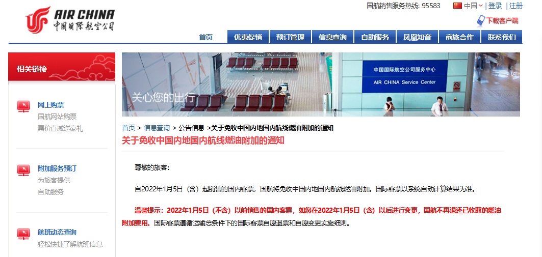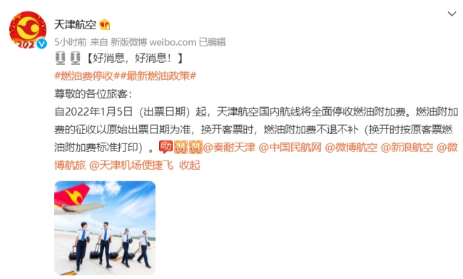 今日,中國國際航空、海南航空、天津航空、西部航空等多家航空公司發(fā)布通知,根據(jù)國家發(fā)展改革委、民航局的相關(guān)文件精神,自2022年1月5日零時(shí)起(出票日期),取消征收國內(nèi)航線燃油附加費(fèi)。