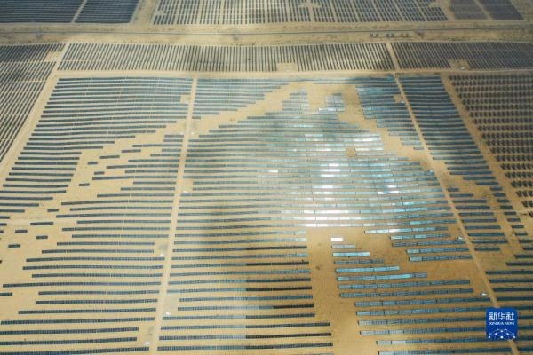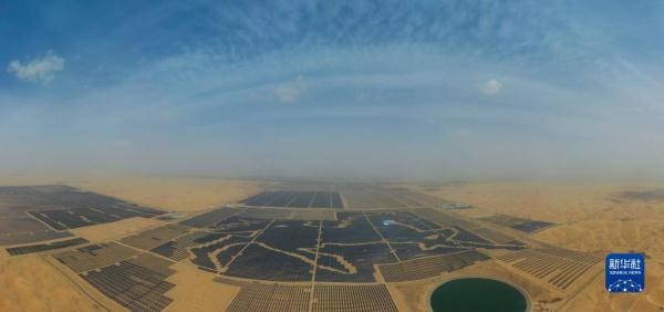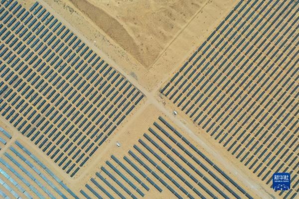 一匹占地130多萬平方米的沙漠“駿馬”橫臥在內(nèi)蒙古自治區(qū)庫布其沙漠之中,這是位于達(dá)拉特光伏發(fā)電應(yīng)用領(lǐng)跑基地中、由近20萬塊光伏板組成的“駿馬電站”。該電站采用“林光互補(bǔ)”模式,板上發(fā)電、板下種植,在開發(fā)利用庫布其沙漠豐富太陽能資源的同時(shí),推動(dòng)沙漠生態(tài)治理。