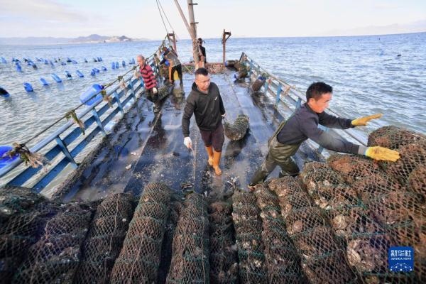 在福建省霞浦縣三沙鎮(zhèn)海域,采蠔工轉(zhuǎn)運采收的生蠔(10月22日攝)。新華社記者 姜克紅 攝