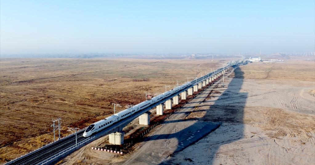 試驗(yàn)列車在銀蘭高鐵甘肅段內(nèi)運(yùn)行。新華社發(fā) 袁暉 攝