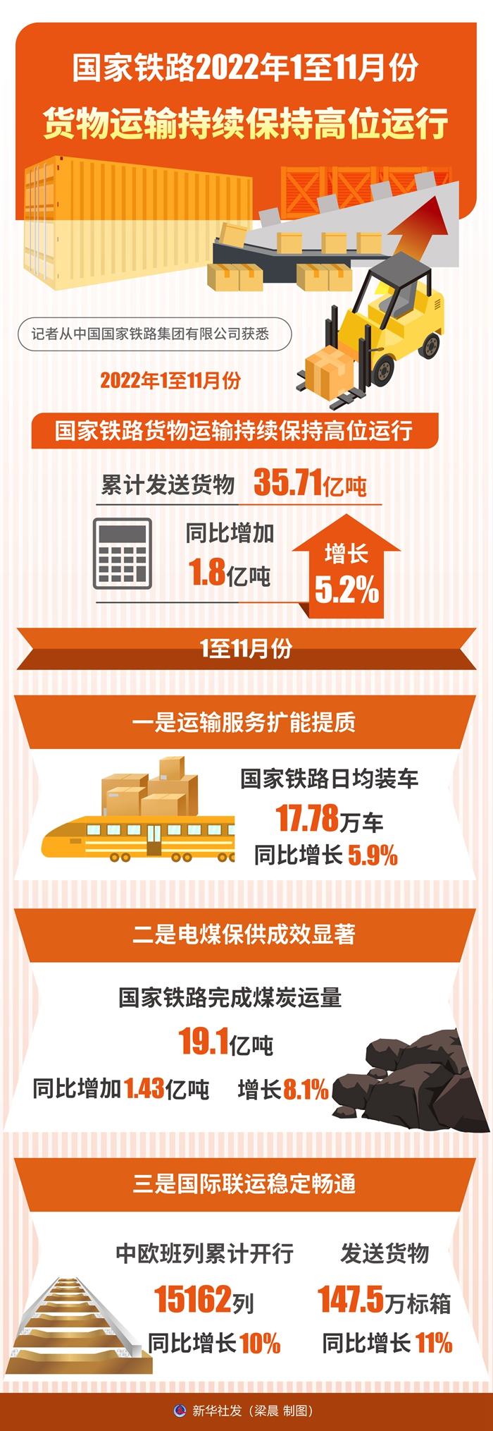 記者從中國國家鐵路集團有限公司獲悉,今年1至11月份,國家鐵路貨物運輸持續(xù)保持高位運行,累計發(fā)送貨物35.71億噸,同比增加1.8億噸、增長5.2%。