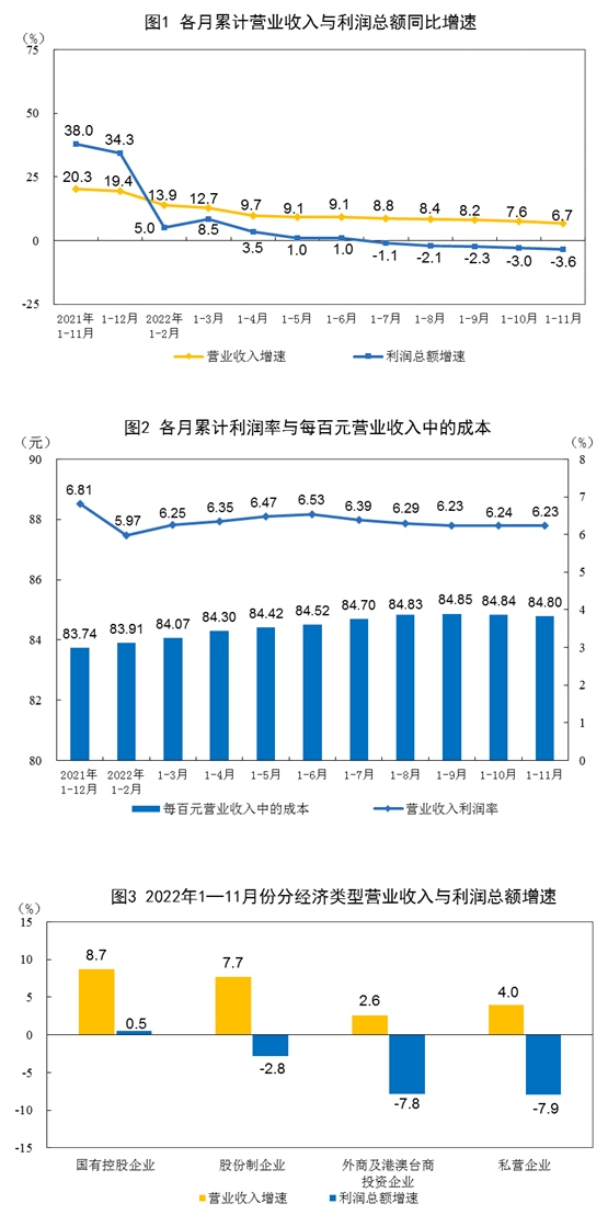 工業(yè)企業(yè)營收保持增長,利潤有所下降。1—11月份,全國規(guī)模以上工業(yè)企業(yè)營業(yè)收入同比增長6.7%,企業(yè)銷售總體保持穩(wěn)定增長。受疫情反彈和需求不足等因素影響,工業(yè)企業(yè)利潤同比下降3.6%,降幅較1—10月份擴(kuò)大0.6個百分點。個別行業(yè)及少數(shù)重點企業(yè)對工業(yè)企業(yè)利潤下拉影響較大。其中,鋼鐵、石油加工行業(yè)利潤同比降幅較大,兩家疫苗重點企業(yè)由于利潤同期基數(shù)較高,利潤同比大幅減少。剔除上述行業(yè)及企業(yè),其他規(guī)上工業(yè)企業(yè)利潤同比增長6.6%。
