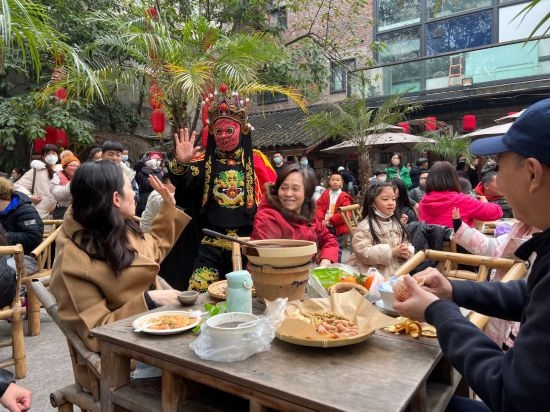 春節(jié)期間,重慶市渝中區(qū)山城巷中,“山城壩壩”茶館的院壩內(nèi)坐滿了客人。人們一邊圍爐煮茶,一邊欣賞臺(tái)上的傳統(tǒng)藝術(shù)表演,川劇變臉演員剎那間切換臉譜,贏得滿堂喝彩。老板舒蓉?zé)崆檎泻糁腿?,將茶水、點(diǎn)心端到桌上,忙得不亦樂乎?!敖衲甏汗?jié)的客流量遠(yuǎn)超預(yù)期,營(yíng)業(yè)額是去年同期的七八倍。”