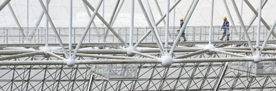 2月13日,工作人員從“中國(guó)天眼”的圈梁上經(jīng)過(guò)。以上圖片均為新華社記者歐東衢攝
