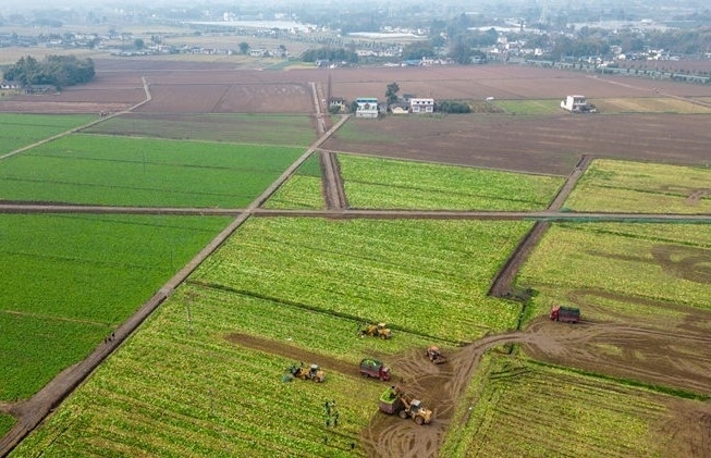 2月9日,四川省眉山市公義鎮(zhèn)欣榮村的村民們正用大型機(jī)械搶收青菜。翁光建攝