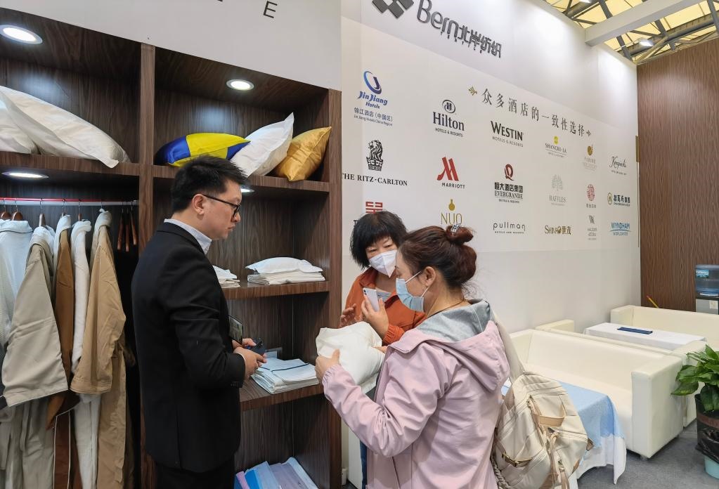 3月28日,觀眾在展會(huì)上詢問(wèn)布草用品。新華社記者 陳愛(ài)平 攝
