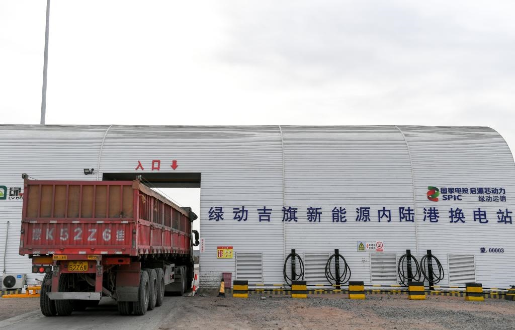 在鄂爾多斯市東勝區(qū)綠動(dòng)萬利新能源智慧陸港,新能源重卡進(jìn)行全自動(dòng)換電。新華社記者貝赫 攝