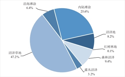 2022年度全國國土變更調(diào)查初步匯總結果顯示,全國共有濕地2357.3萬公頃。其中,紅樹林地2.9萬公頃,森林沼澤220.7萬公頃,灌叢沼澤75.4萬公頃,沼澤草地1112.9萬公頃,沿海灘涂149.9萬公頃,內(nèi)陸灘涂602.4萬公頃,沼澤地193.2萬公頃。
