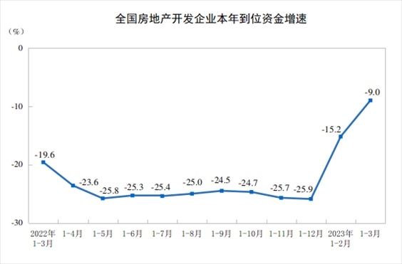 1—3月份,房地產(chǎn)開發(fā)企業(yè)到位資金34708億元,同比下降9.0%。其中,國內(nèi)貸款4995億元,下降9.6%;利用外資8億元,下降22.7%;自籌資金10171億元,下降17.9%;定金及預(yù)收款11909億元,下降2.8%;個人按揭貸款6188億元,下降2.9%。