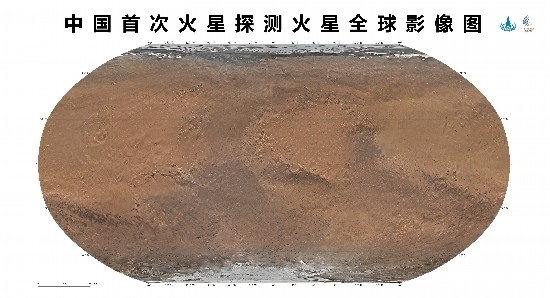 天問一號任務環(huán)繞器中分辨率相機,于2021年11月至2022年7月歷時8個月,實施了284軌次遙感成像,對火星表面實現(xiàn)了全球覆蓋。地面應用系統(tǒng)對獲取的14757幅影像數(shù)據(jù)進行處理后得到火星全球彩色影像圖。