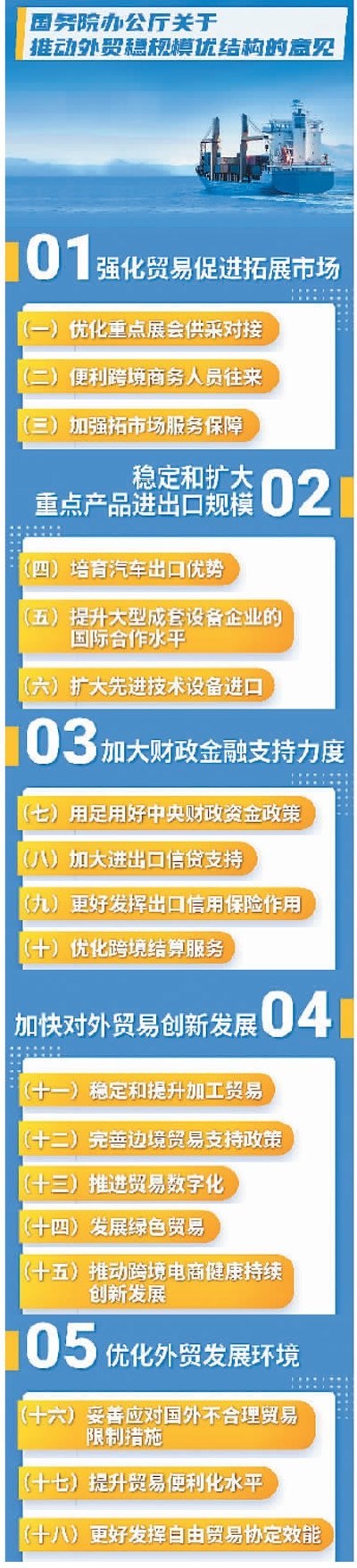 為推動(dòng)外貿(mào)穩(wěn)規(guī)模優(yōu)結(jié)構(gòu),在前期已出臺(tái)多輪政策舉措的基礎(chǔ)上,國務(wù)院辦公廳4月25日對外發(fā)布《關(guān)于推動(dòng)外貿(mào)穩(wěn)規(guī)模優(yōu)結(jié)構(gòu)的意見》(以下簡稱《意見》),推出新一輪措施。專家認(rèn)為,此次提出的18條具體措施既涉及重點(diǎn)產(chǎn)品,也關(guān)乎市場拓展和貿(mào)易創(chuàng)新,具有很強(qiáng)的針對性和操作性,有助于穩(wěn)住外貿(mào)規(guī)模,并在此基礎(chǔ)上進(jìn)一步優(yōu)化外貿(mào)結(jié)構(gòu),推動(dòng)實(shí)現(xiàn)全年進(jìn)出口促穩(wěn)提質(zhì)目標(biāo)任務(wù)。
