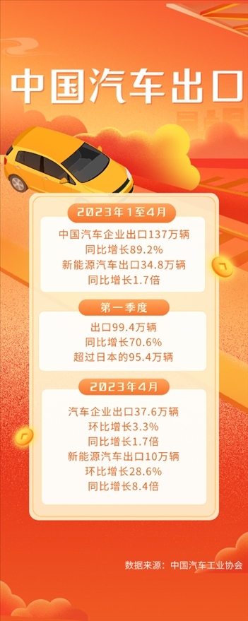 中國汽車工業(yè)協(xié)會(huì)的統(tǒng)計(jì)數(shù)據(jù)顯示,今年第一季度,國內(nèi)汽車企業(yè)出口99.4萬輛,同比增長70.6%,超過日本的95.4萬輛。最新數(shù)據(jù)顯示,4月份,出口37.6萬輛,同比增長1.7倍,其中,電動(dòng)、混動(dòng)等新能源汽車出口10萬輛,環(huán)比增長28.6%,同比增長8.4倍,保持良好勢頭。