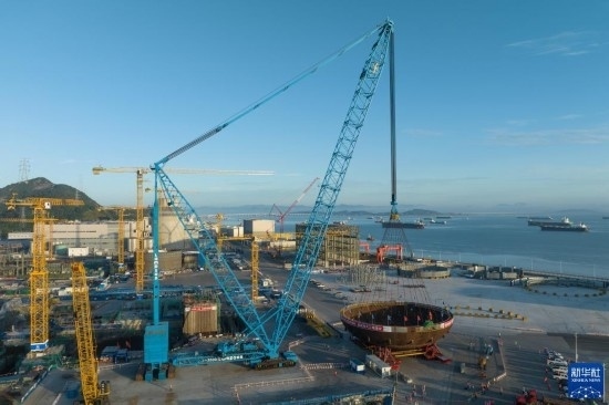 這是5月29日拍攝的三門(mén)核電二期工程4號(hào)機(jī)組核島鋼制安全殼底封頭吊裝現(xiàn)場(chǎng)。