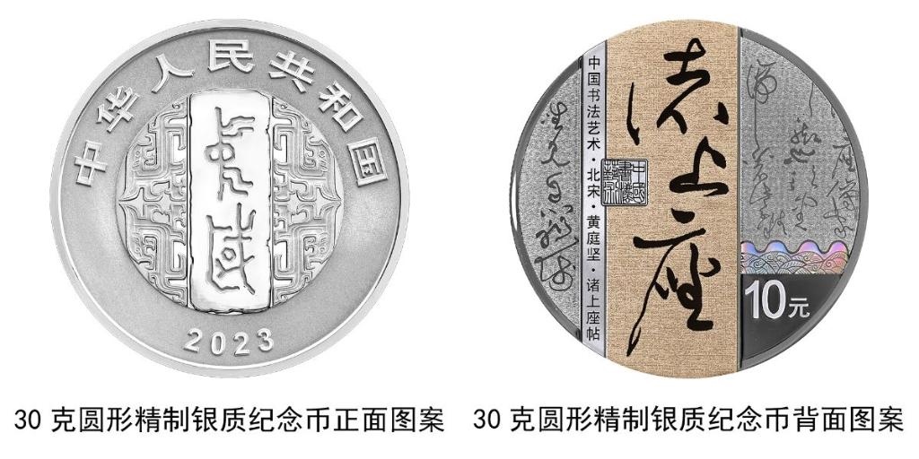 30克圓形銀質(zhì)紀(jì)念幣背面圖案為北宋黃庭堅(jiān)書(shū)《諸上座帖》局部文字及“諸上座”字樣與筆架、“中國(guó)書(shū)法藝術(shù)”篆刻鈐印等組合設(shè)計(jì),并刊“中國(guó)書(shū)法藝術(shù)·北宋·黃庭堅(jiān)·諸上座帖”字樣及面額。