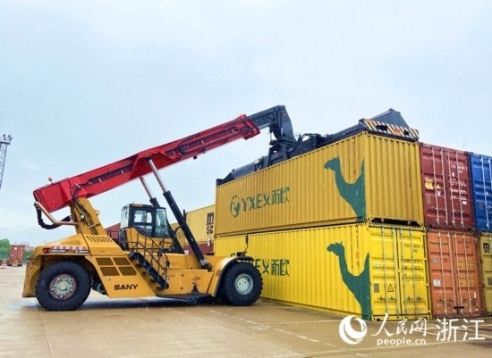 來到義烏鐵路口岸,往來車輛川流不息。繁忙運(yùn)作的堆場內(nèi),義烏市陸港鐵路口岸發(fā)展有限公司工作人員何江橋正操作一臺碩大的集裝箱正面吊,將一個(gè)個(gè)海關(guān)查驗(yàn)后的集裝箱送至龍門吊下,等待裝上即將發(fā)車的“義新歐”中歐班列。