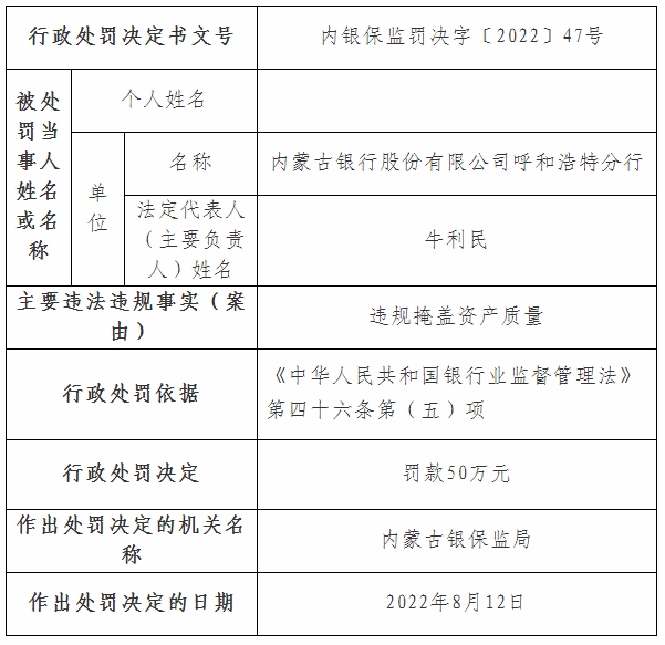 班文慧、宋建軍作為內(nèi)蒙古銀行呼和浩特分行違規(guī)掩蓋資產(chǎn)質(zhì)量責(zé)任人,被處以警告。