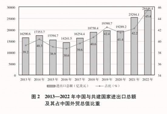 貿(mào)易投資規(guī)模穩(wěn)步擴(kuò)大。2013-2022年,中國(guó)與共建國(guó)家進(jìn)出口總額累計(jì)19.1萬億美元,年均增長(zhǎng)6.4%;與共建國(guó)家雙向投資累計(jì)超過3800億美元,其中中國(guó)對(duì)外直接投資超過2400億美元;中國(guó)在共建國(guó)家承包工程新簽合同額、完成營(yíng)業(yè)額累計(jì)分別達(dá)到2萬億美元、1.3萬億美元。2022年,中國(guó)與共建國(guó)家進(jìn)出口總額近2.9萬億美元,占同期中國(guó)外貿(mào)總值的45.4%,較2013年提高了6.2個(gè)百分點(diǎn);中國(guó)民營(yíng)企業(yè)對(duì)共建國(guó)家進(jìn)出口總額超過1.5萬億美元,占同期中國(guó)與共建國(guó)家進(jìn)出口總額的53.7%。