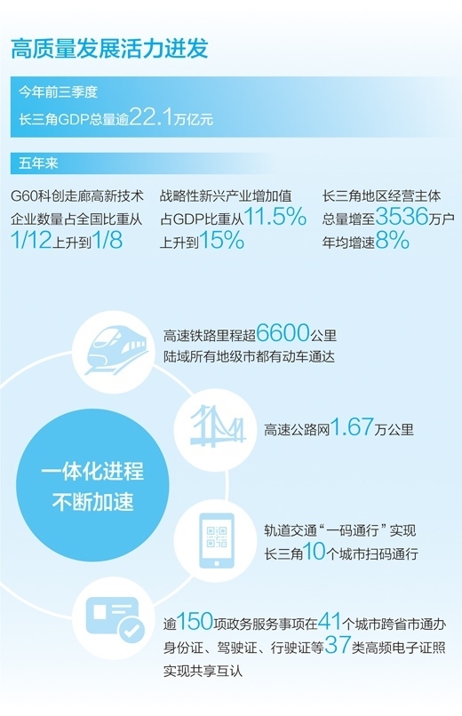 今年前三季度,長(zhǎng)三角GDP總量逾22.1萬(wàn)億元,占全國(guó)GDP總量比重較2022年同期有所提升,三省一市經(jīng)濟(jì)增速均超過(guò)了全國(guó)平均水平;作為長(zhǎng)三角一體化發(fā)展國(guó)家戰(zhàn)略的先手棋和突破口,長(zhǎng)三角生態(tài)綠色一體化發(fā)展示范區(qū)掛牌以來(lái),共形成136項(xiàng)務(wù)實(shí)有效的制度創(chuàng)新成果,其中38項(xiàng)已面向全國(guó)復(fù)制推廣;已有逾150項(xiàng)政務(wù)服務(wù)事項(xiàng)可在長(zhǎng)三角41個(gè)城市跨省市通辦,實(shí)現(xiàn)身份證、駕駛證、行駛證等37類(lèi)高頻電子證照的共享互認(rèn)……