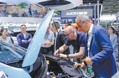 外國觀眾在北京車展廣汽埃安展臺參觀。王子牧攝