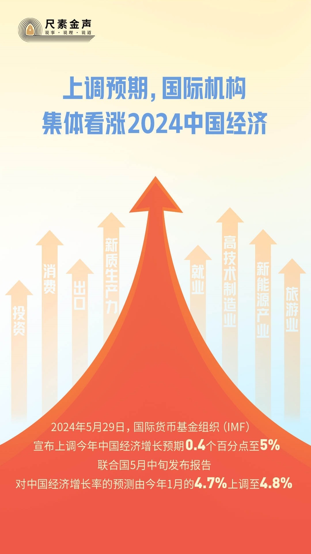 5月29日,國際貨幣基金組織(IMF)宣布上調(diào)今年中國經(jīng)濟(jì)增長預(yù)期0.4個(gè)百分點(diǎn)至5%。聯(lián)合國5月中旬發(fā)布報(bào)告,對(duì)中國經(jīng)濟(jì)增長率的預(yù)測由今年1月的4.7%上調(diào)至4.8%。4月以來,亞洲開發(fā)銀行、摩根士丹利、高盛、瑞銀等國際金融機(jī)構(gòu)紛紛上調(diào)對(duì)中國經(jīng)濟(jì)增速的全年預(yù)期。