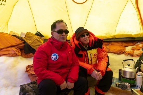 姚檀棟(左)、湯普森在普若崗日冰原10號冰川冰穹C作業(yè)點工作帳篷內(nèi)查看作業(yè)情況時合影。新華社記者姜帆 攝