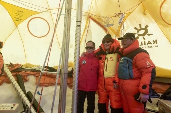 姚檀棟、湯普森在海拔5400米的普若崗日冰原科考主營地與部分科考隊員合影。新華社記者劉詩平 攝
