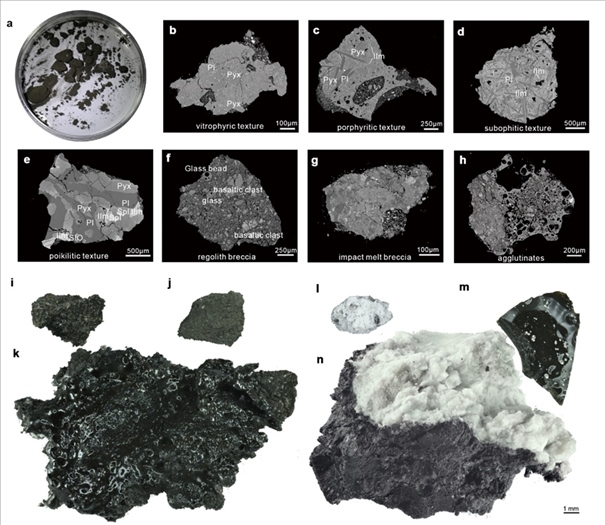 研究發(fā)現(xiàn),嫦娥六號采集的巖屑碎片主要由玄武巖、角礫巖、粘結(jié)巖、淺色巖石和玻璃質(zhì)物質(zhì)組成。其中,玄武巖碎片占總量的30%至40%,角礫巖和粘結(jié)巖由玄武巖碎屑、玻璃珠、玻璃碎片以及少量的斜長巖和蘇長巖等淺色巖石碎屑物質(zhì)構(gòu)成,進(jìn)一步揭示了樣品來源的復(fù)雜性。