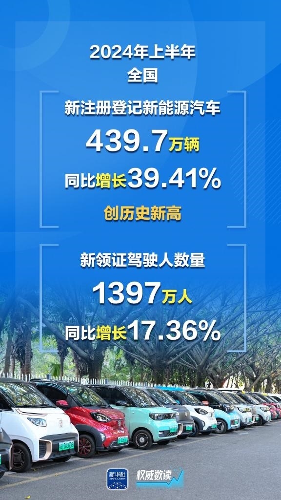 公安部7月8日發(fā)布最新統(tǒng)計(jì)數(shù)據(jù),截至2024年6月底,全國(guó)機(jī)動(dòng)車(chē)保有量達(dá)4.4億輛,機(jī)動(dòng)車(chē)駕駛?cè)?.32億人;上半年新注冊(cè)登記新能源汽車(chē)439.7萬(wàn)輛,同比增長(zhǎng)39.41%,創(chuàng)歷史新高;上半年全國(guó)新領(lǐng)證駕駛?cè)藬?shù)量1397萬(wàn)人。
