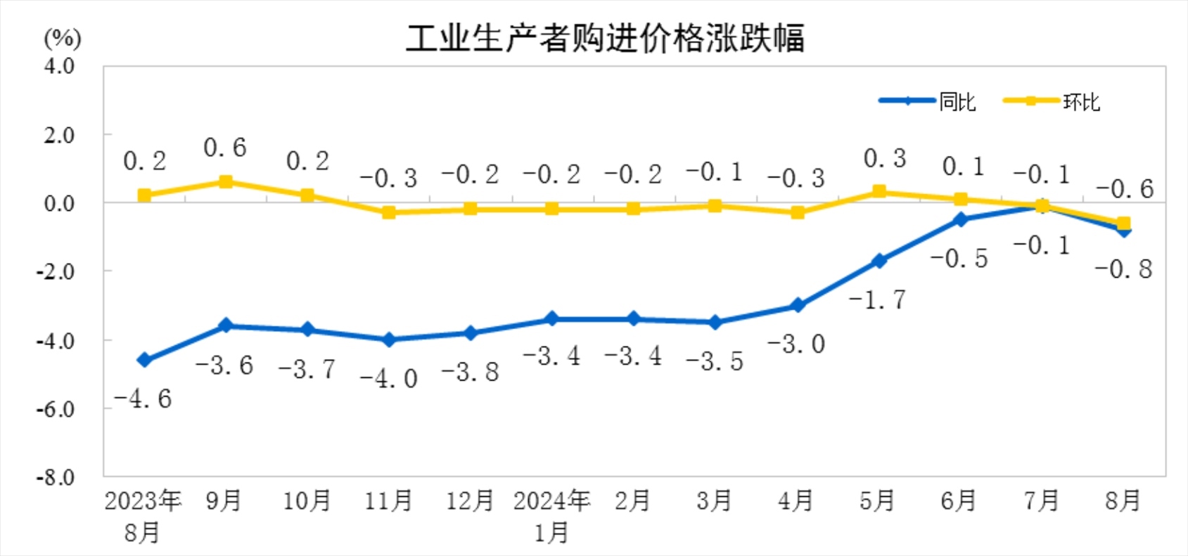 2024年8月份,全國工業(yè)生產(chǎn)者出廠價(jià)格同比下降1.8%,環(huán)比下降0.7%;工業(yè)生產(chǎn)者購進(jìn)價(jià)格同比下降0.8%,環(huán)比下降0.6%。1—8月平均,工業(yè)生產(chǎn)者出廠價(jià)格比上年同期下降1.9%,工業(yè)生產(chǎn)者購進(jìn)價(jià)格下降2.1%。