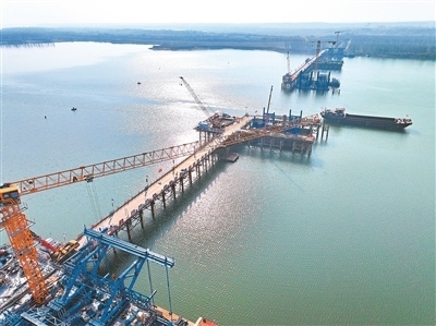 江西省南昌市南昌縣昌南大橋項目施工現(xiàn)場,工人在加緊推進橋梁承臺和引橋建設(shè)。