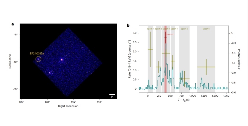 此后,世界各地多個(gè)天文望遠(yuǎn)鏡陸續(xù)觀測到EP240315a。研究結(jié)果表明,EP240315a產(chǎn)生于遙遠(yuǎn)的早期宇宙,當(dāng)時(shí)宇宙年齡僅為現(xiàn)在的10%,EP240315a的信號(hào)花費(fèi)了125億年才抵達(dá)地球。