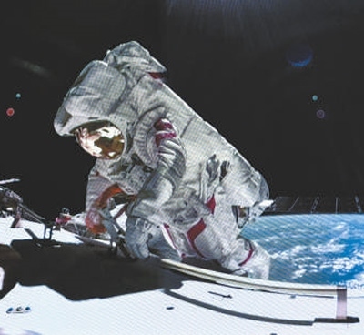 神舟十七號(hào)航天員湯洪波在空間站組合體艙外作業(yè)畫面。