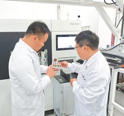 科研人員在檢查“材料數(shù)據(jù)工廠(chǎng)”高通量設(shè)備制備的多組元合金樣品。
