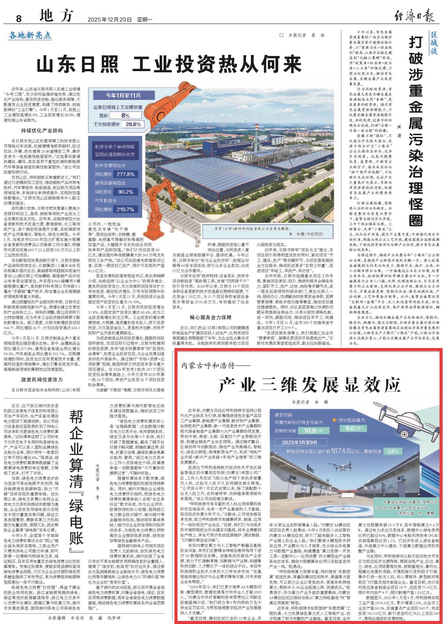 2025年12月29日,《經(jīng)濟(jì)日?qǐng)?bào)》第8版刊發(fā)題為《內(nèi)蒙古呼和浩特——產(chǎn)業(yè)三維發(fā)展顯效應(yīng)》的文章,報(bào)道了內(nèi)蒙古自治區(qū)呼和浩特市堅(jiān)持以現(xiàn)代化產(chǎn)業(yè)體系為引領(lǐng),通過(guò)鏈?zhǔn)秸?、區(qū)域協(xié)同與創(chuàng)新驅(qū)動(dòng),推動(dòng)產(chǎn)業(yè)向高端化、智能化、綠色化轉(zhuǎn)型,培育新質(zhì)生產(chǎn)力,形成“傳統(tǒng)產(chǎn)業(yè)升級(jí)+新興產(chǎn)業(yè)突破+未來(lái)產(chǎn)業(yè)培育”的三維發(fā)展模式。