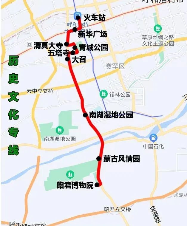 歷史文化專(zhuān)線(xiàn)(火車(chē)站——昭君博物院)途經(jīng):錫林北路、新華大街、通道南路、中山西路、石羊橋路、大東街、大北街、大南街、昭君路。沿途設(shè)站:火車(chē)站、新華廣場(chǎng)、清真大寺、青城公園、五塔寺、大召、南湖濕地公園、蒙古風(fēng)情園、昭君博物院,單程:17.2公里,配車(chē):8臺(tái)。