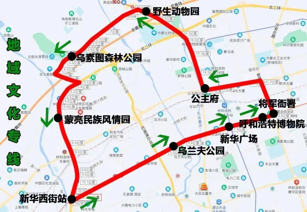 地域文化專(zhuān)線(xiàn)(新華西街站——蒙亮民族風(fēng)情園),途經(jīng):新華西街、新華大街、哲里木路、海拉爾大街、通道北路、生態(tài)路、鹽站西街、北二環(huán)輔道、西二環(huán)輔道。沿途設(shè)站:新華西街,烏蘭夫公園、新華廣場(chǎng)、呼和浩特博物院、將軍衙署、公主府、野生動(dòng)物園、烏素圖森林公園、蒙亮民族風(fēng)情,全程:29公里,配車(chē):10臺(tái)。