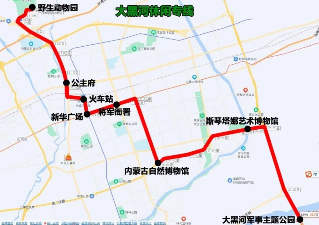 大黑河休閑專(zhuān)線(xiàn)(大青山野生動(dòng)物園——大黑河軍事主題公園),途經(jīng):Y317、通道北路、車(chē)站西街、錫林北路、新華大街、興安南路、金橋路、大黑河北岸路。沿途設(shè)站:野生動(dòng)物園、公主府、火車(chē)站、新華廣場(chǎng)、將軍衙署、內(nèi)蒙古自然博物館、斯琴塔娜藝術(shù)博物館、大黑河軍事主題公園,單程:30.7公里,配車(chē):8—10臺(tái)。