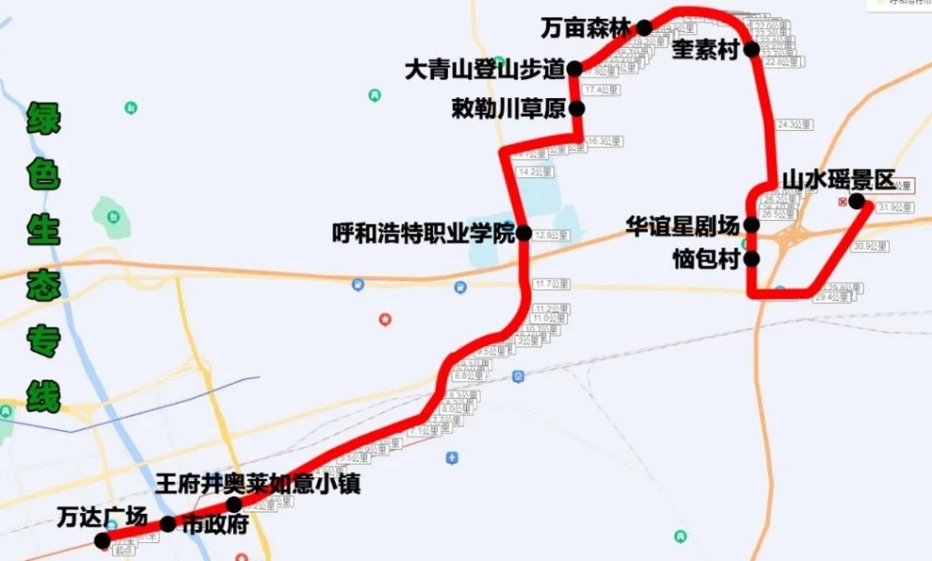 綠色生態(tài)專(zhuān)線(xiàn)(萬(wàn)達(dá)廣場(chǎng)——山水瑤景區(qū))途經(jīng):新華東街、機(jī)場(chǎng)路、S101、呼和塔拉東街、野馬圖路、Y371、惱包路、110國(guó)道、S105省道。沿途設(shè)站:萬(wàn)達(dá)廣場(chǎng)、市政府、王府井奧萊如意小鎮(zhèn)、呼和浩特職業(yè)學(xué)院、敕勒川草原、大青山登山步道、萬(wàn)畝森林、奎素村、華誼星劇場(chǎng)、惱包村、山水謠景區(qū),單程:33公里,配車(chē):8—10臺(tái)。